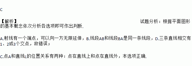 C 【解析】试题分析:根据平面图形的基本概念依次分析各选项即可作出判断. A.射线有一个端点,可以向一方无限延伸,B.线段AB和线段BA是同一条线段,D.三条直线相交有1、2或3个交点,故错误; C.点A和直线L的位置关系有两种:点在直线上和点在直线外,本选项正确.