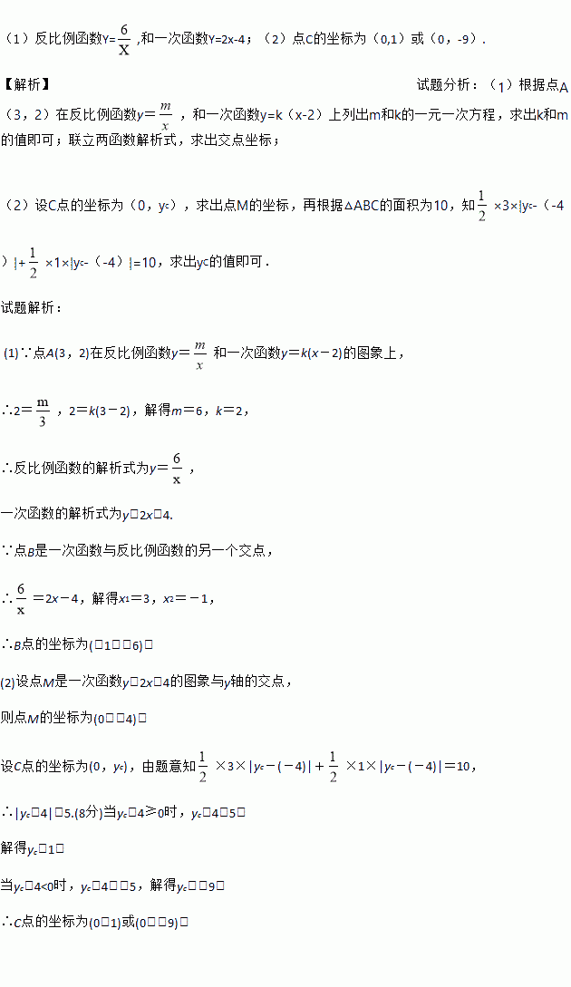 (1)反比例函数Y=,和一次函数Y=2x-4;(2)点C的坐标为(0,1)或(0,-9). 【解析】试题分析:(1)根据点A(3,2)在反比例函数y=,和一次函数y=k(x-2)上列出m和k的一元一次方程,求出k和m的值即可;联立两函数解析式,求出交点坐标; (2)设C点的坐标为(0,yc),求出点M的坐标,再根据△ABC的面积为10,知×3×|yc-(-4)|+×1×|yc-(-4)...