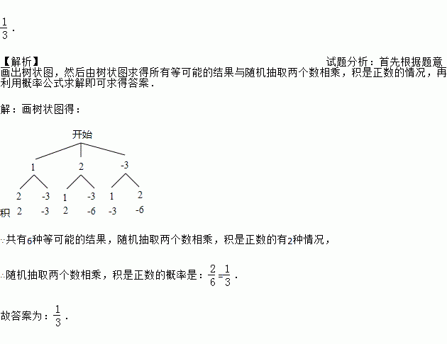 . 【解析】试题分析:首先根据题意画出树状图,然后由树状图求得所有等可能的结果与随机抽取两个数相乘,积是正数的情况,再利用概率公式求解即可求得答案. 【解析】 画树状图得: ∵共有6种等可能的结果,随机抽取两个数相乘,积是正数的有2种情况, ∴随机抽取两个数相乘,积是正数的概率是:=. 故答案为:.