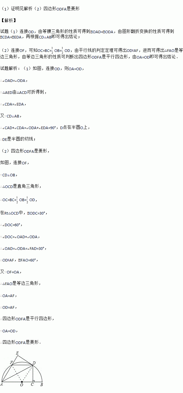 如图,AB是半圆O的直径,点C为半径OB上一点,过点C作CD丄AB交半圆O于点D,将△ACD沿AD折叠得到△AED,AE交半圆于点F,连接DF.
