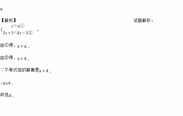 A 【解析】试题解析: , 由①得,x>a, 由②得,x>4, ∵不等式组的解集是x>4, ∴a≤4. 故选A.