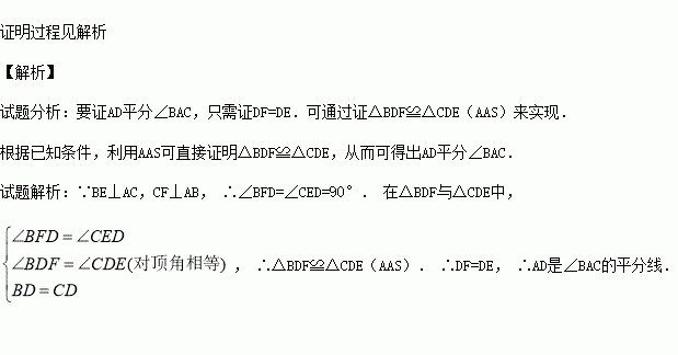 如图,已知BE⊥AC,CF⊥AB,垂足分别为E,F,BE,CF相交于点D,若BD=CD.求证:AD平分∠BAC.