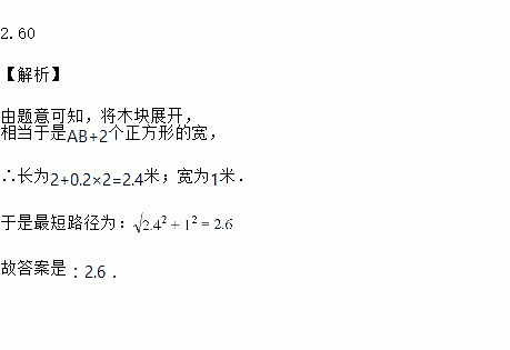 在一个长为2米,宽为1米的矩形草地上,如图堆放着一根长方体的木块,它的棱长和场地宽AD平行且>AD,木块的正视图是边长为0.2米的正方形,一只蚂蚁从点A处,到达C处需要走的最短路程是________米.