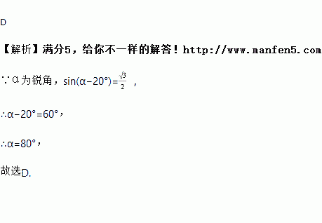 已知α为锐角,sin (α-20°)=,则α等于( )