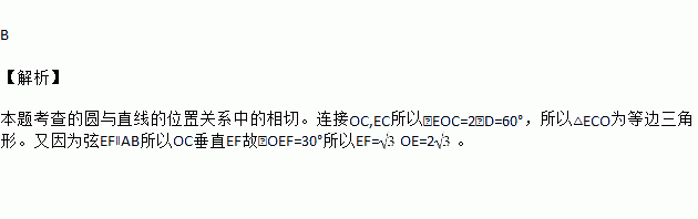 如图,直线AB与半径为2的⊙O相切于点C,D是⊙O上一点,且∠EDC=30°,弦EF∥AB,则EF的长度为( )