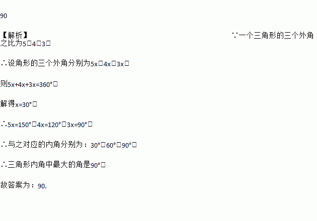 90 【解析】∵一个三角形的三个外角之比为5:4:3, ∴设角形的三个外角分别为5x,4x,3x, 则5x+4x+3x=360°, 解得x=30°, ∴5x=150°,4x=120°,3x=90°, ∴与之对应的内角分别为:30°,60°,90°, ∴三角形内角中最大的角是90°, 故答案为:90.