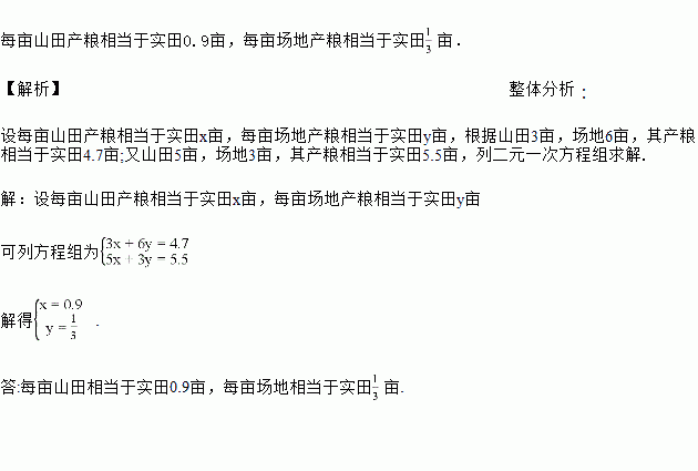 译文为:假如有山田3亩,场地6亩,其产粮相当于实田4.7亩;又山田5亩,场地3亩,其产粮相当于实田5.5亩,问每亩山田和每亩场地产粮各相当于实田多少亩?请你解答.