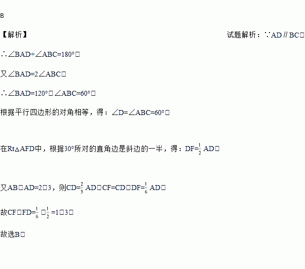 如图,平行四边形ABCD中,AE⊥BC,AF⊥DC,AB:AD=2:3,∠BAD=2∠ABC,则CF:FD的结果为( )