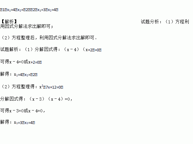 (1)x1=4,x2=﹣2;(2)x1=3,x2=4. 【解析】试题分析:(1)方程利用因式分解法求出解即可; (2)方程整理后,利用因式分解法求出解即可. 试题解析:(1)分解因式得:(x﹣4)(x+2)=0, 可得x﹣4=0或x+2=0, 解得:x1=4,x2=﹣2; (2)方程整理得:x2﹣7x+12=0, 分解因式得:(x﹣3)(x﹣4)=0, ...