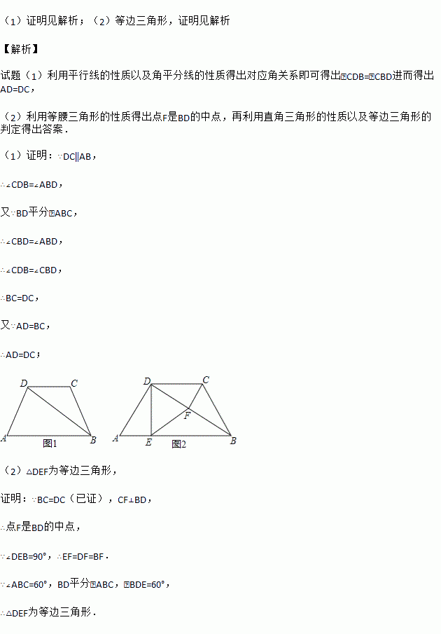 (2)如图2,在上述条件下,若∠A=∠ABC=60°,过点D作DE⊥AB,过点C作CF⊥BD,垂足分别为E、F,连接EF.判断△DEF的形状并证明你的结论.