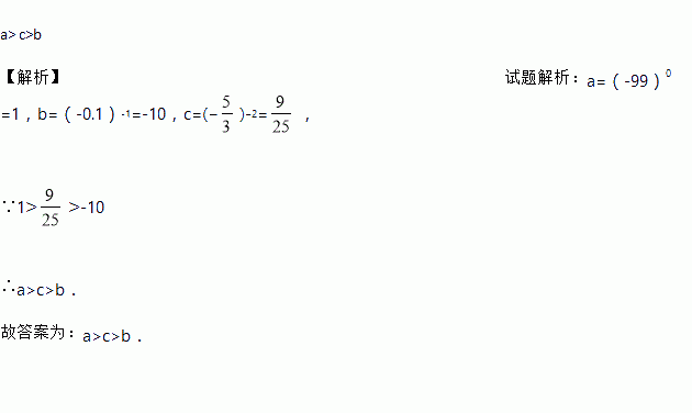 如果a=(-99)0 ,b=(-0.1)-1,c=(-)-2,那么a、b.c三数大小关系为__________.(用“>”连接)