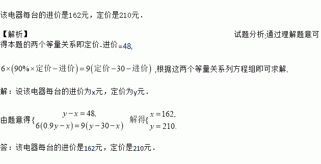 某商场按定价销售某种电器时,每台可获利48元,按定价的九折销售该电器6台与将定价降低30元销售该电器9台所获得的利润相等.求该电器每台的进价、定价各是多少元?