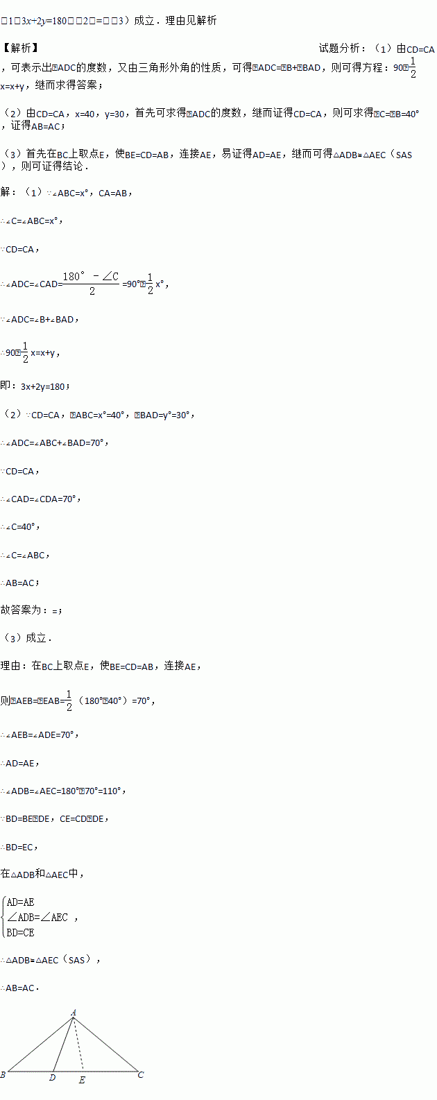 (1)3x+2y=180;(2)=;(3)成立.理由见解析 【解析】试题分析:(1)由CD=CA,可表示出∠ADC的度数,又由三角形外角的性质,可得∠ADC=∠B+∠BAD,则可得方程:90﹣x=x+y,继而求得答案; (2)由CD=CA,x=40,y=30,首先可求得∠ADC的度数,继而证得CD=CA,则可求得∠C=∠B=40°,证得AB=AC; (3)首先在BC上取点E,使B...