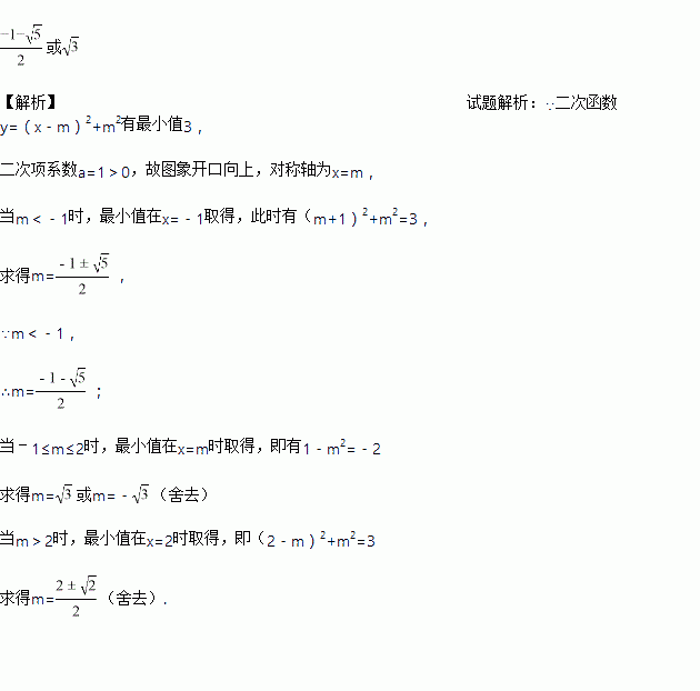当﹣1≤x≤2时,二次函数y=(x﹣m)2+m2有最小值3,则实数m的值为_____.