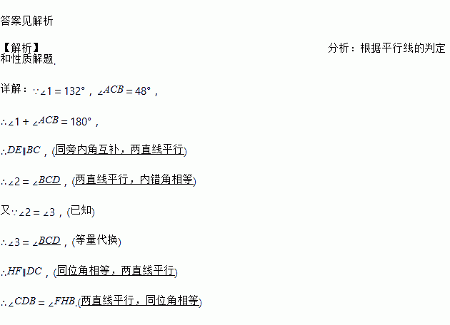 已知,如图,∠1=132°,∠ACB=48°,∠2=∠3.