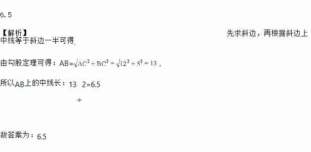 在中,∠C=,AC=12,BC=5,则AB边上的中线CD=_______.