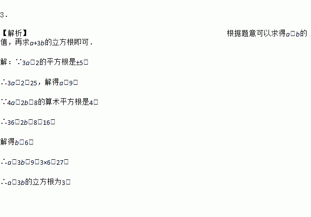 3£® ¡¾½âÎö¡¿¸ù¾ÝÌâÒâ¿ÉÒÔÇóµÃa¡¢bµÄÖµ£¬ÔÙÇóa+3bµÄÁ¢·½¸ù¼´¿É£® ¡¾½âÎö¡¿ ¡ß3a£2µÄƽ·½¸ùÊÇ¡À5£¬ ¡à3a£2£½25£¬½âµÃa£½9£® ¡ß4a£2b£8µÄËãÊõƽ·½¸ùÊÇ4£¬ ¡à36£2b£8£½16£¬ ½âµÃb£½6£¬ ¡àa£«3b£½9£«3¡Á6£½27£® ¡àa£«3bµÄÁ¢·½¸ùΪ3£®