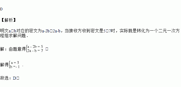 为确保信息安全,信息需加密传输,发送方将明文加密后传输给接收方,接收方收到密文后解密还原为明文,已知某种加密规则为,明文a,b对应的密文为a﹣2b,2a﹣b,例如:明文2,1对应的密文是0,3,当接收方收到的密文是5,7时,解密得到的明文是( )