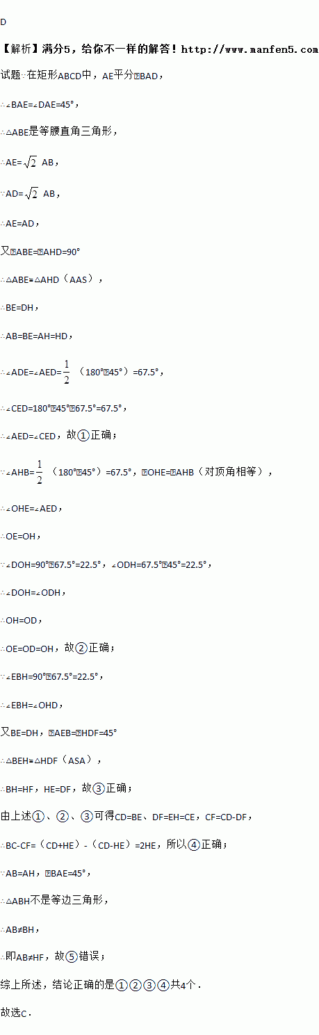 AB,∠BAD的平分线交BC于点E,DH⊥AE于点H,连接BH并延长交CD于点F,连接DE交BF于点O,下列结论:①∠AED=∠CED;②OE=OD;③BH=HF;④BC﹣CF=2HE;⑤AB=HF,其中正确的有( )