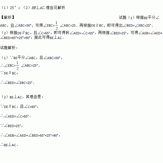 如图,已知DE∥BC,BE平分∠ABC,∠C=65°,∠ABC=50°.
