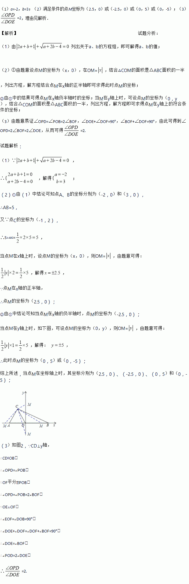 ②在坐标轴的其它位置是否存在点M,使三角形COM的面积三角形ABC的面积的一半仍然成立? 若存在,请直接写出符合条件的点M的坐标;