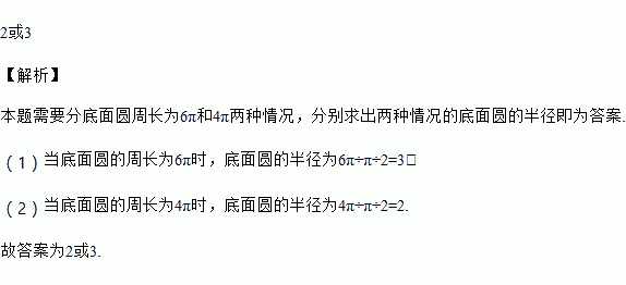 已知一个圆柱的侧面展开图是如图所示的矩形,长为6π,宽为4π,那么这个圆柱底面圆的半径为 ________.