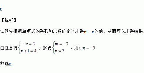 若-mxny是关于x、y的一个单项式,且其系数为3,次数为4,则mn的值为( )