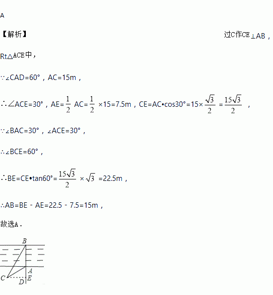 如图,小明为了测量河宽AB,先在BA延长线上取一点D,再在同岸取一点C,测得∠CAD=60°,∠BCA=30°,AC=15 m,那么河AB宽为( )