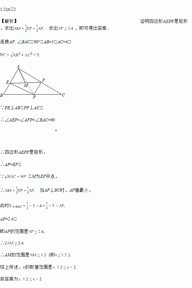 如图,在△ABC中,∠BAC=90°,AB=3,AC=4,P为边BC上一动点(且点P不与点B、C重合),PE⊥AB于E,PF⊥AC于F,M为EF中点.设AM的长为x,则x的取值范围是__________________________.