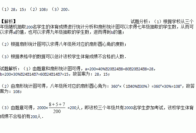 某校对七、八、九年级的学生进行体育水平测试,成绩评定为优秀、良好、合格、不合格四个等第.为了解这次测试情况,学校从三个年级随机抽取200名学生的体育成绩进行统计分析.相关数据的统计图、表如下: