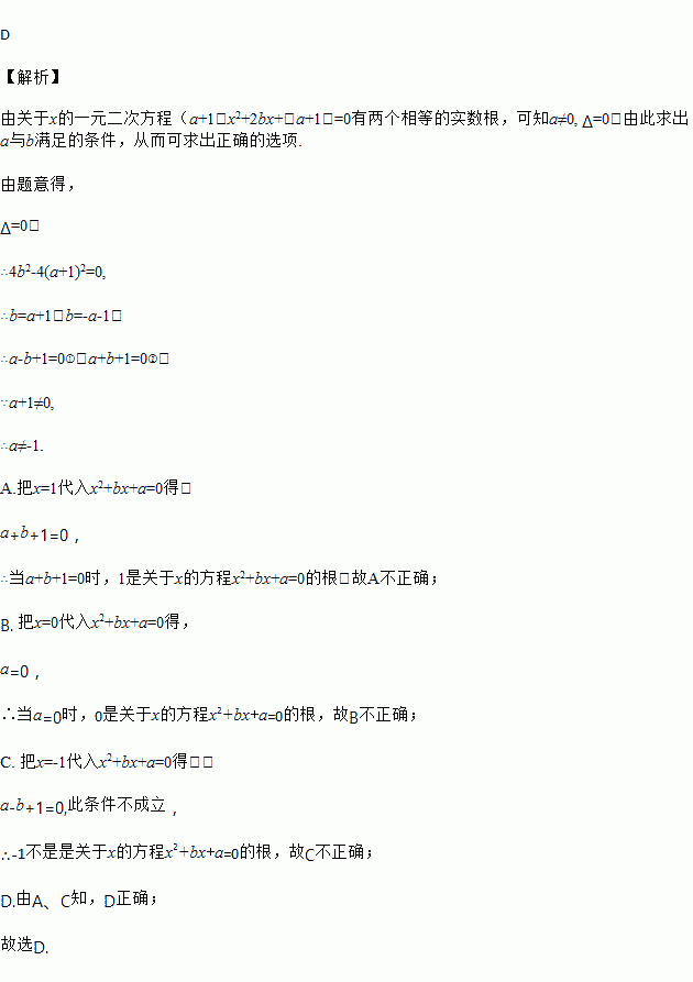 已知关于x的一元二次方程(a+1)x2+2bx+(a+1)=0有两个相等的实数根,下列判断正确的是( )
