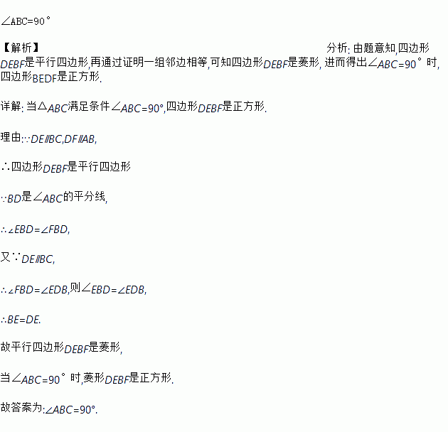 如图,BD是△ABC的角平分线,DE∥BC,交AB于点E,DF∥AB,交BC于点F,当△ABC满足_________条件 时,四边形BEDF是正方形.