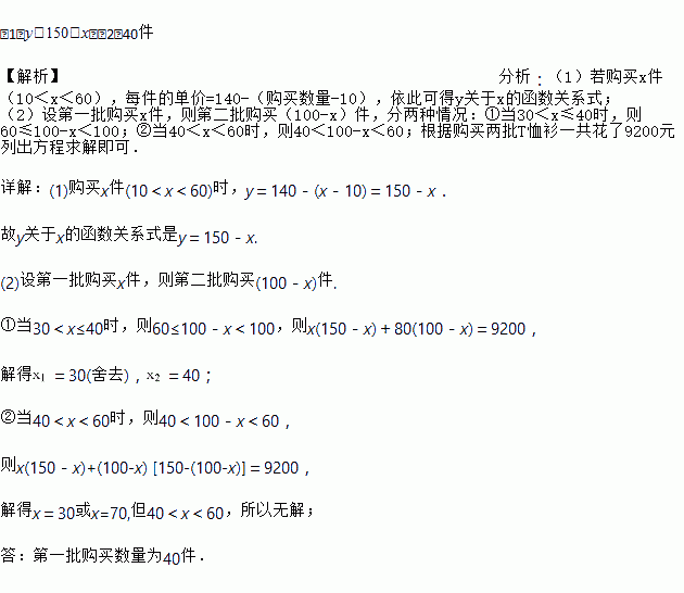 (2)如果该公司共购买了100件T恤衫,由于某种原因需分两批购买,且第一批购买量多于30件且少于60件.已知购买两批T恤衫一共花了9200元,求第一批T恤衫的购买数量.