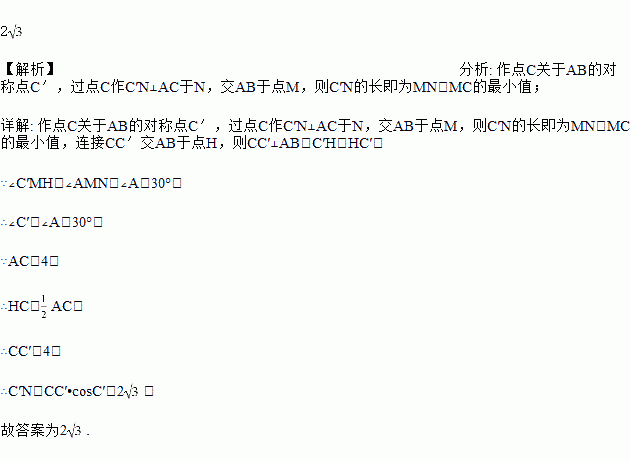 如图,在Rt△ABC中,∠C=90°,∠A=30°,AC=4,M是AB边上一动点,N是AC边上的一动点,则MN+MC的最小值为_____.