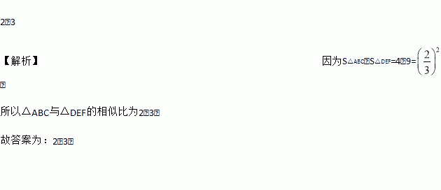 2:3 【解析】因为S△ABC:S△DEF=4:9= , 所以△ABC与△DEF的相似比为2:3, 故答案为:2:3.