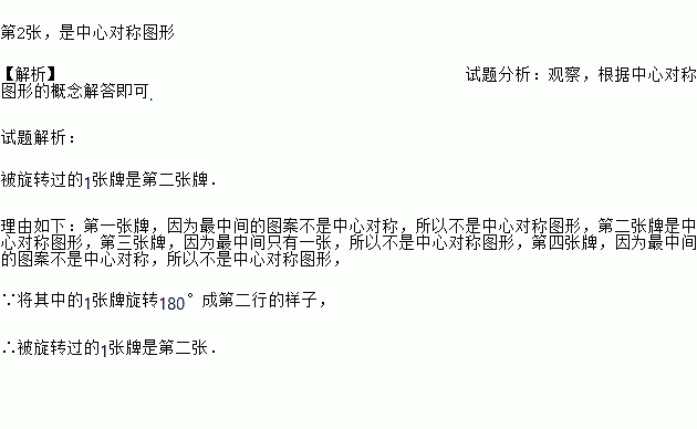 如图,将给出的4张扑克牌摆成第一行的样子,然后将其中的1张牌旋转180°成第二行的样子,你能判断出被旋转过的1张牌是哪一张吗?为什么?