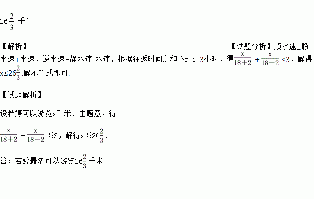 若婷去桂林漓江风景区游览,乘坐摩托艇顺水而下,然后返回登艇处.已知水流速度是2千米/时,摩托艇在静水中的速度是18千米/时,为了使游览时间不超过3小时,若婷最多可以游览多少千米?