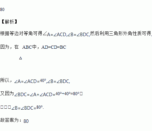 如图,在△ABC中,D为AB上一点,AD=CD=BC,若∠ACD=40°,则∠B=_____°.