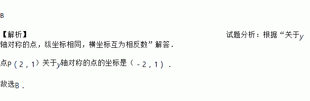B 【解析】试题分析:根据“关于y轴对称的点,纵坐标相同,横坐标互为相反数”解答. 点P(2,1)关于y轴对称的点的坐标是(-2,1). 故选B.