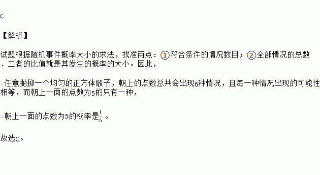 掷一个质地均匀的正方体骰子,当骰子停止后,朝上一面的点数为5的概率是( )