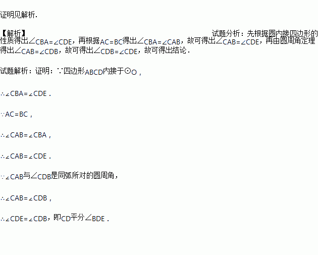 如图,已知四边形ABCD内接于⊙O,E是AD延长线上一点,且AC=BC,求证:DC平分∠BDE
