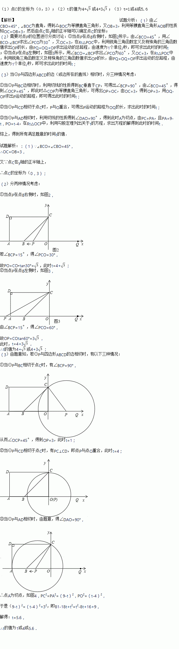(3)以点P为圆心,PC为半径的⊙P随点P的运动而变化,当⊙P与四边形ABCD的边(或边所在的直线)相切时,求t的值.