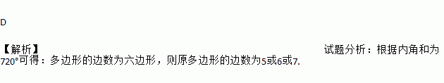 D 【解析】试题分析:根据内角和为720°可得:多边形的边数为六边形,则原多边形的边数为5或6或7.