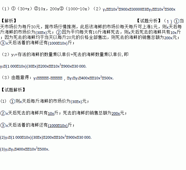 (1)①(30+x)②10x,200x③(1000-10x)(2)y1=-10x2+900x+30000(3)y2=-10x2+500x 【解析】【试题分析】(1)①当天市场价为每斤30元,据市场行情推测,此后该海鲜的市场价每天每斤可上涨1元,则x天后每斤海鲜的市场价为(30+x)元;②因为平均每天有10斤海鲜死去,则x天后死去的海鲜共有10x斤;因为死去的海鲜均于当天以每斤20元的价格全部...