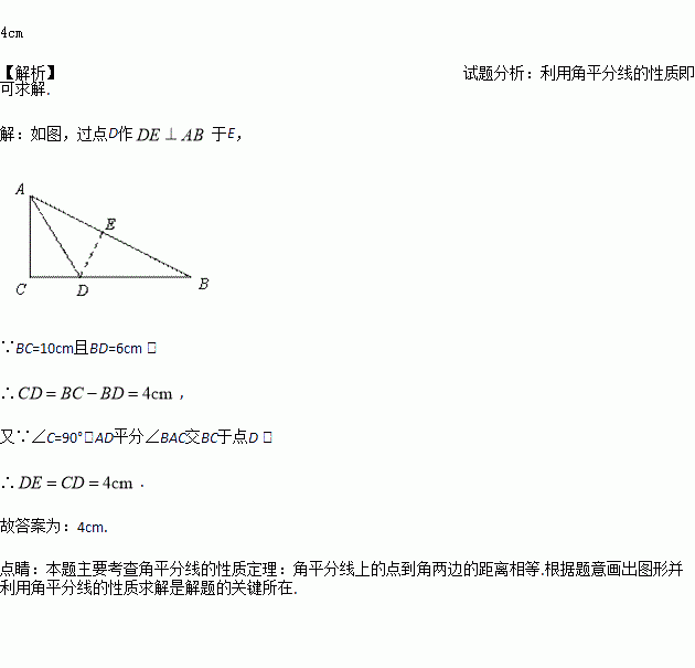 △ABC中,∠C=90°,AD平分∠BAC交BC于点D,BC=10cm且BD=6cm,则点D到AB的距离是__________.