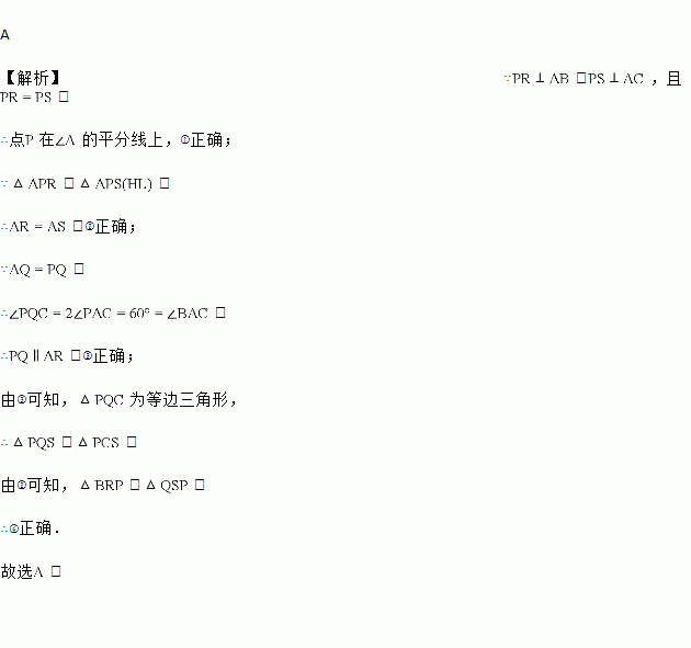 A 【解析】∵,,且, ∴点在的平分线上,①正确; ∵≌, ∴,②正确; ∵, ∴, ∴,③正确; 由③可知,为等边三角形, ∴≌, 由②可知,≌, ∴④正确. 故选.