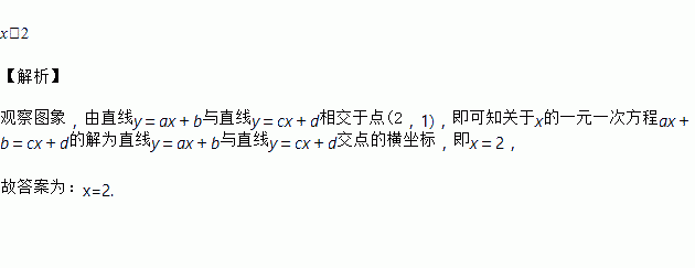 如图,直线y=ax+b与直线y=cx+d相交于点(2,1),则关于x的一元一次方程ax+b=cx+d的解为__________.