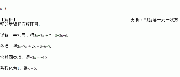 解方程:3x-7(x-1)=3-2(x+3)