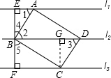 如图,已知l1∥l2∥l3,矩形ABCD的四个顶点在l1、l2、l3上,过B作EF⊥l2,分别交l1、l3于E、F,若AE=1,FC=4,则l1与l2之间的距离是________.