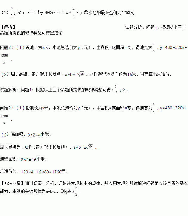(2)应用“问题1”题中的规律,求水池的最低造价